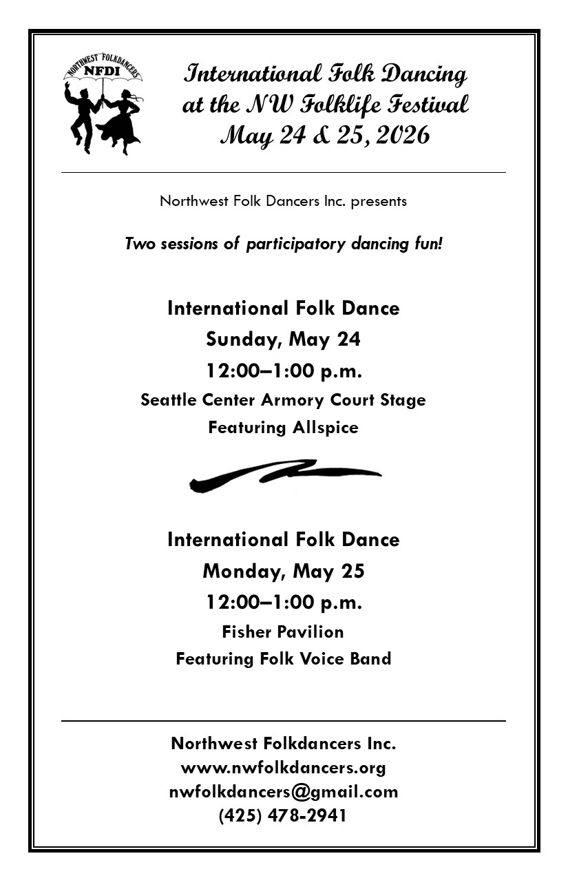 Join NFDI at the NW Folklife Festival for two sessions of international folk dancing: Sunday, May 24,on the Seattle Center Armory Court Stage, Allspice plays, 12:00-1:00 p.m. On Monday, May 25, Folk Voice Band plays for the International Folk Dance, 12:00-1:00 p.m., at Fisher Pavilion. Download a flyer.