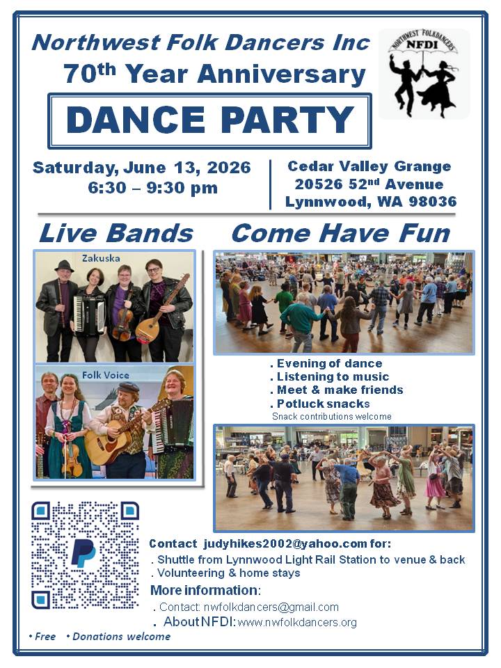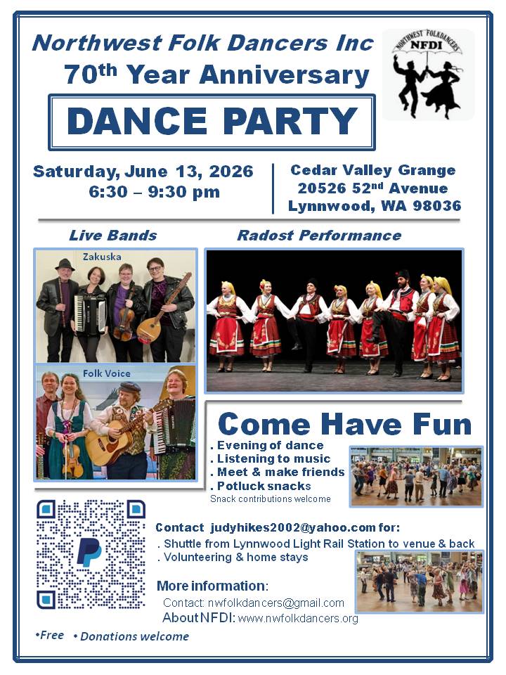Join NFDI in celebrating its 70th anniversary at a dance party on June 13, 6:30-9:30 p.m. at the Cedar Valley Grange in Lynnwood, Washington! Two bands will play: Folk Voice Band (international favorites) and Zakuska (Balkan). In addition to dancing, there will be cake, historical exhibits, and more! Plan to join us for this fun evening. Rides will be available from the Lynnwood light rail station to the hall (and back). Download a flyer!